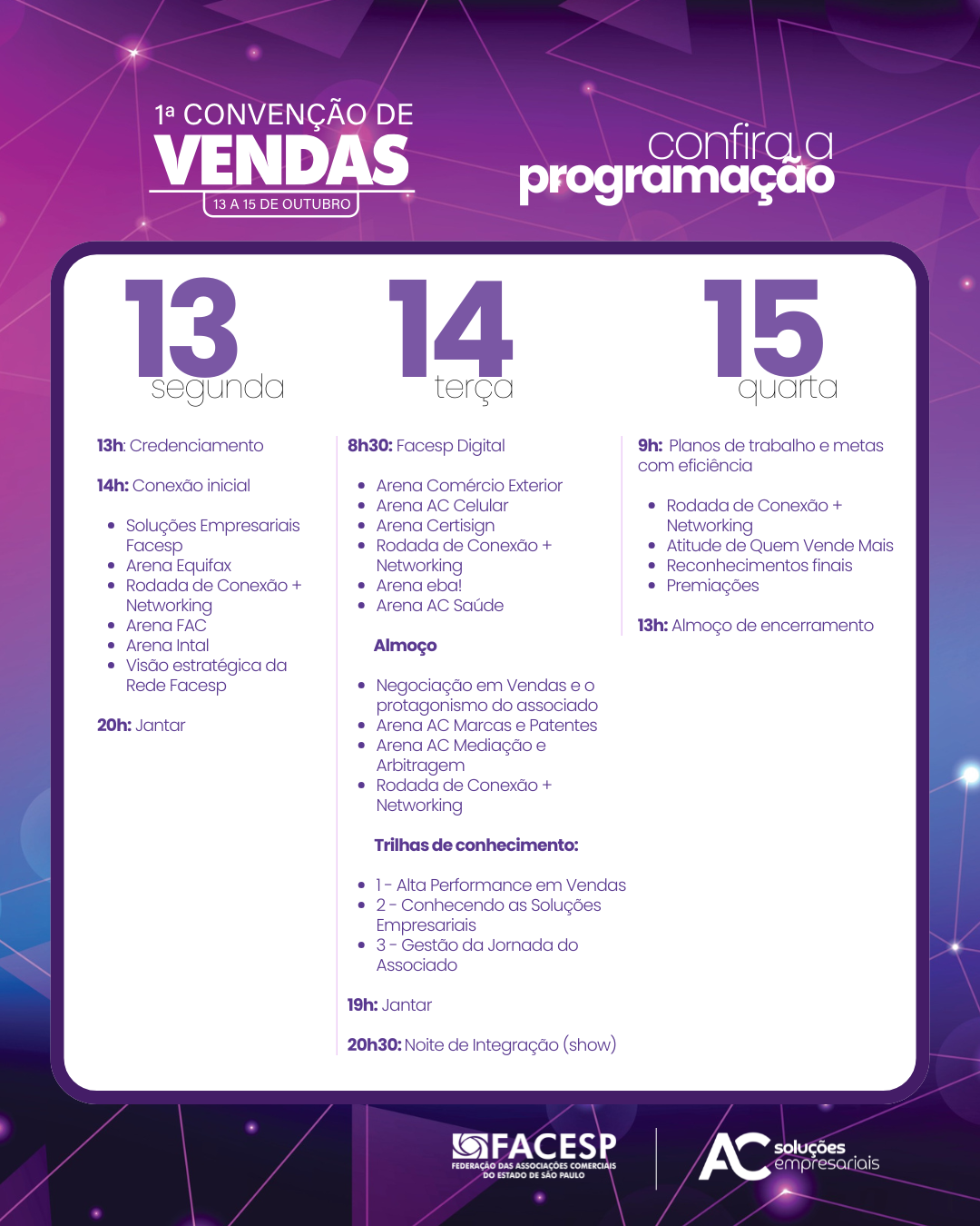 Entre os destaques estão a palestra “Negociação em Vendas e o Protagonismo do Associado” e as trilhas de conhecimento, que irão aprofundar três grandes eixos: Alta Performance em Vendas, Conhecendo as Soluções Empresariais e Gestão da Jornada do Associado
