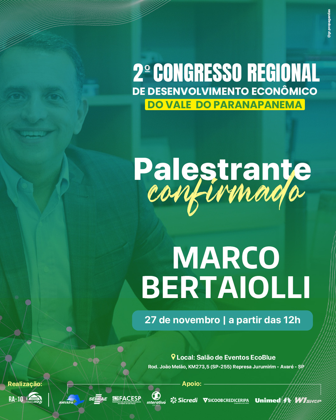 O conselheiro da Facesp, Marco Bertaiolli, será um dos grandes destaques do 2º Congresso Regional de Desenvolvimento do Vale do Paranapanema, que ocorre no dia 27 de novembro, a partir das 12h, no Salão de Eventos Ecoblue, em Avaré.