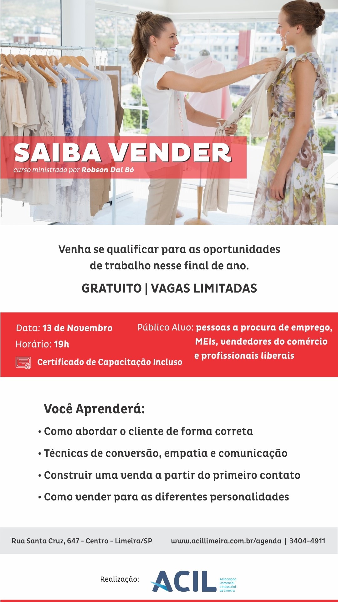A ACIL trará a palestra “Saiba Vender”, no dia 13 de novembro, às 19h, e será apresentada por Robson Dal Bó. O curso, que é gratuito, possui foco nos vendedores do comércio, e é uma ótima oportunidade para quem está em busca de uma chance nas contratações do Fim de Ano, inclusive com o recebimento de um certificado que comprova a sua capacitação para o atendimento ao público.