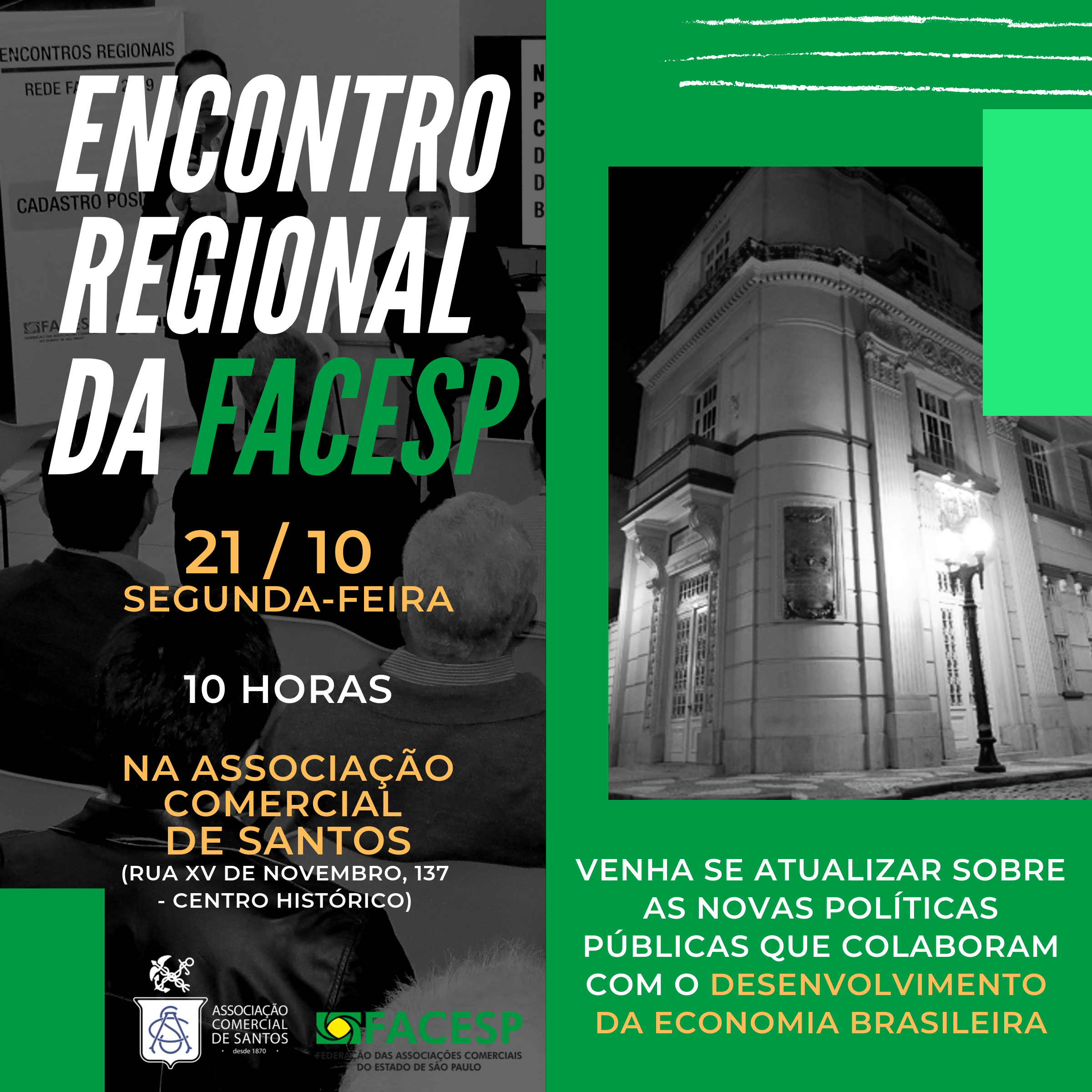 A Associação Comercial de Santos (ACS) recebe nesta segunda-feira (21), a partir das 10 horas, o Encontro Regional promovido pela Federação das Associações Comerciais do Estado de São Paulo (Facesp). O evento reunirá as 20 Associações Comerciais da Região Administrativa 05 (RA 05) - Litoral Paulista da Facesp. Os municípios que compõem a RA 05 são: Bertioga, Cajati, Cananéia, Cubatão, Guarujá, Iguape, Ilha Comprida, Itanhaém, Itariri, Jacupiranga, Juquiá, Miracatu, Mongaguá, Pariquera-Açu, Pedro de Toledo, Peruíbe, Praia Grande, Registro, Santos e São Vicente.