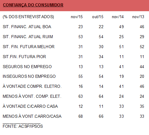Em novembro de 2014, o INC foi de 153 pontos – o melhor resultado daquele ano. O mês, tradicionalmente costuma apontar uma subida na confiança em função das compras de fim de ano. Todavia, em razão das crises econômica e política, tem-se observado o oposto em 2015.
