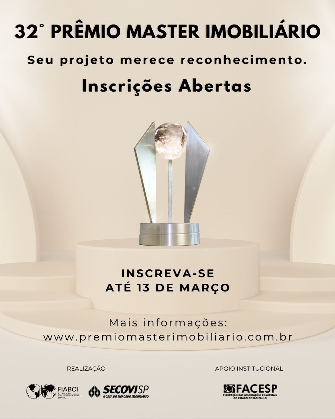 As inscrições para o Prêmio Master Imobiliário 2026 estão abertas. Realizado por meio da parceria entre a FIABCI-Brasil e o Secovi-SPo prêmio chega à 32ª edição, consolidando mais de três décadas de reconhecimento à excelência, à inovação e às boas práticas do mercado imobiliário brasileiro. A iniciativa conta com o apoio da Facesp.