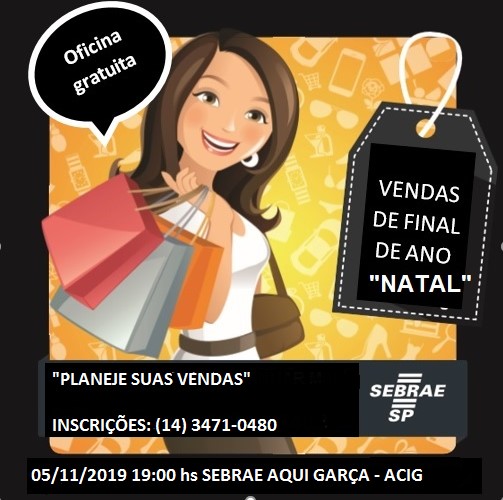 Vender. Uma das ações do comércio. Sem vendas a economia estagnou e o empreendedor não pode prosseguir. Com a proximidade do Natal a expectativa de aumento de vendas toma novas proporções e, sempre pensando nas estratégias e nas possibilidades a Associação Comercial e Industrial de Garça (ACIG) traz para Garça, numa parceria com o Sebrae Aqui, a palestra “Planeje suas Vendas”. Totalmente gratuita a palestra está marcada para o dia 5 de novembro, a partir das 19 horas.